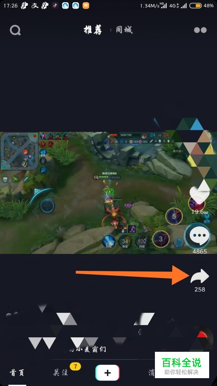 在推荐或者关注里面刷到自己喜欢的想要做壁纸的视频之后点击箭头所指分享按钮。