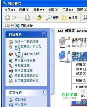 此时打开“网络连接”再次右键单击“本地连接”选择属性。