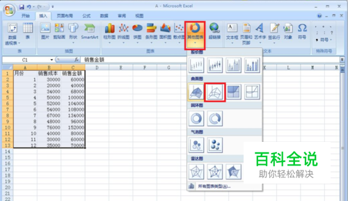 点击“插入”选项中的“其他图表”在下拉菜单中选择曲面图。