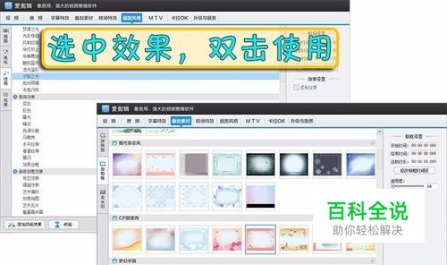将界面切换到“叠加素材—加相框”列表,选中要是用的相框,点击列表左下方的“添加相框效果”按钮即可使用;如果要更换相框,只需双击要使用的相框,就可以更换了。 将界面切换到“画面风格”面板,点击“画面”、“美化”、“滤镜”、“动景”左侧栏,在列表中双击即可使用;使用后可以在列表右侧对效果进行设置。
