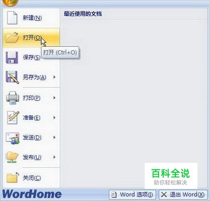 一、打开Word2007窗口,依次单击“Office按钮”→“打开”命令。