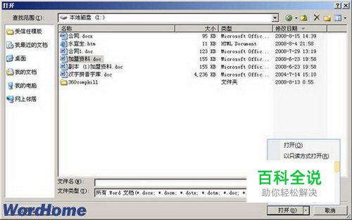 二、在打开的“打开”对话框中,选中需要打开的Word文档,然后单击“打开”按钮右侧的下拉三角按钮。在打开的菜单中选择“以副本方式打开”选项即可。