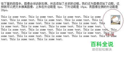 在编辑器中输入以下代码: <html> <head> <style type="text/css"> img { float:right; border:1px dotted black; margin:0px 0px 15px 20px; } </style> </head> <body> <p>在下面的段落中,图像会浮动到右侧,并且添加了点状的边框。我们还为图像添加了边距,这样就可以把文本推离图像:上和右外边距是 0px,下外边距是 15px,而图像左侧的外边距是 20px。</p> <p> <img src="/i/eg_cute.gif" /> This is some text. This is some text. This is some text. This is some text. This is some text. This is some text. This is some text. This is some text. This is some text. This is some text. This is some text. This is some text. This is some text. This is some text. This is some text. This is some text. This is some text. This is some text. This is some text. This is some text. This is some text. This is some text. This is some text. This is some text. This is some text. This is some text. This is some text. This is some text. This is some text. This is some text. </p> </body> </html>