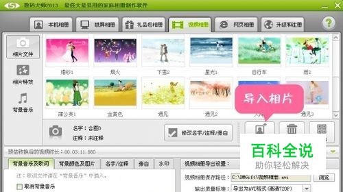 悉数导入图片,巧用文字特效功能,为视频添加字幕说明 图片制作了视频,我们使用软件的“视频相册”功能。点击“添加相片”按钮,即可将相片文件悉数导入软件中,通过鼠标点击拖拽相片,快速调整相片的播放顺序。然而,点击“修改名字/注释/旁白”按钮,利用文字特效功能,为视频添加字幕说明,叙说视频制作背后的有趣故事。