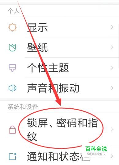 进入之后,点击图示位置的“锁屏、密码和指纹”,进入下一页面,如图所示。