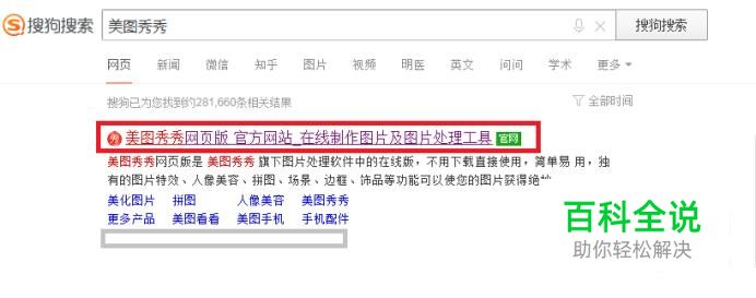 首先,使用搜狗搜索“美图秀秀”,在搜索结果中点击进入带有“官网”标识的“美图秀秀网页版”。