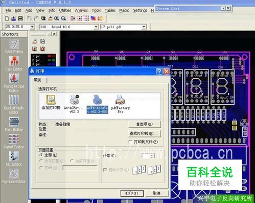 点击打印机图标后生成一个打印预览,先从它的导航栏第一行点鼠标右键并选Properties(道具),先选择打印机,然后可设置打印方向(纵向和横向)、打印方式(标准、整板打在一张纸内、PCB、屏幕可视区域三种,并可选择只打印选中部分。标准方式时可自定义比例和X、Y修正值,比例可根据需要自行修改,修正值为1,一般不能去动它)、Margins栏为打印内容的位置,选中即可。