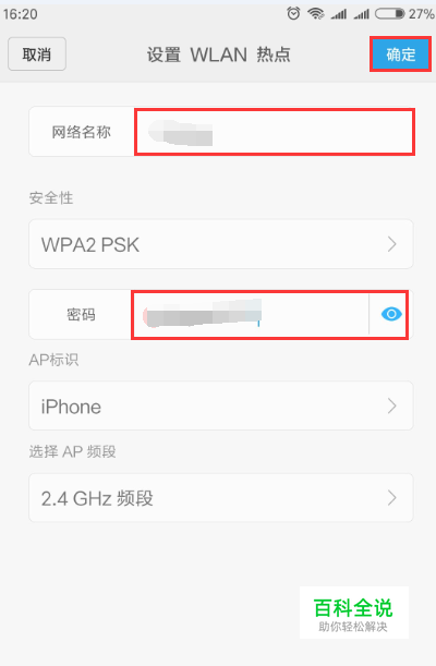 设置WLAN热点网络名称,安全性设置对应的连接密码;如图;