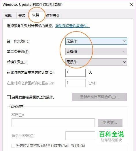 再点击“ 恢复”,将下面的“第一次失败”、“第二次失败”、“后续失败”全部设为“无操作”,再应用和确定。