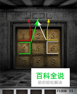 100层电梯游戏第十五关看似复杂,其实稍微仔细一点就能看明白了。电梯门是需要输入密码才能打开的,但是密码在哪呢?其实电梯门框上方的符号就是密码提示。在电梯门上找到与门上方的符号相对应的数字输入即可。具体就不解释了,直接看上图就能明白,小编分别用四种颜色标记了出来。