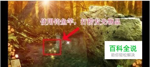 进入失落之城场景11游戏界面之后,我们看见鱼塘里面有一个发光物品,但是距离太远不知道是什么,鱼塘也不知道有什么危险。首先打开物品栏,选中物品栏中的钓鱼竿,使用钓鱼竿将发光物品勾上来(如图红框所示)。
