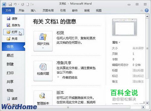 相对于Word2007的Office按钮,Word2010中的“文件”按钮更有利于Word2003用户快速迁移到Word2010。“文件”按钮是一个类似于菜单的按钮,位于Word2010窗口左上角。单击“文件”按钮可以打开“文件”面板,包含“信息”、“最近”、“新建”、“打印”、“共享”、“打开”、“关闭”、“保存”等常用命令,如图2009120101所示。图2009120101 “文件”面板