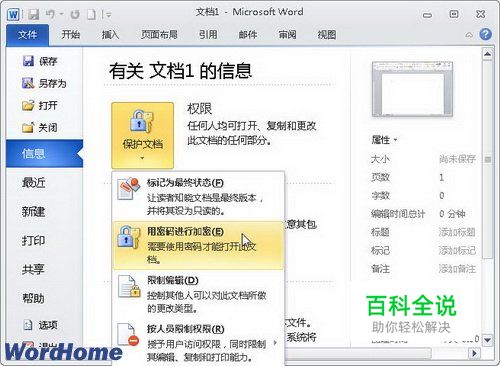 在默认打开的“信息”命令面板中,用户可以进行旧版本格式转换、保护文档(包含设置Word文档密码)、检查问题和管理自动保存的版本,如图2009120102所示。图2009120102 “信息”命令面板