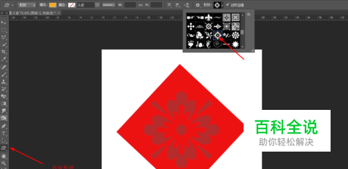 然后选择自定形状工具,画一个花形的装饰,点击花形的图层右键栅格化图层,再把花形图层的不透明度改为30%,如图所示