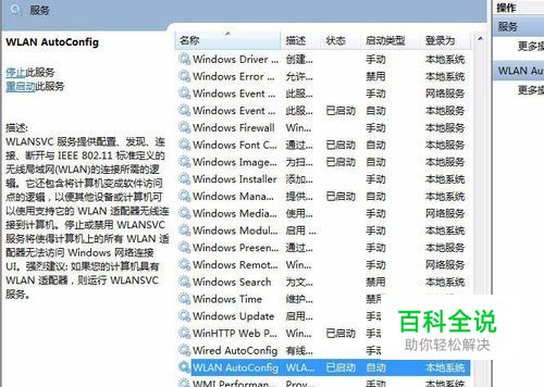 先查看计算机是否开启WLANSVC服务,右键点击“计算机”——“管理”——“服务和应用程序”——“服务”——“WLAN AutoConfig”(注意:有的有两个,一个是有线,一个是无线,开启第二个)