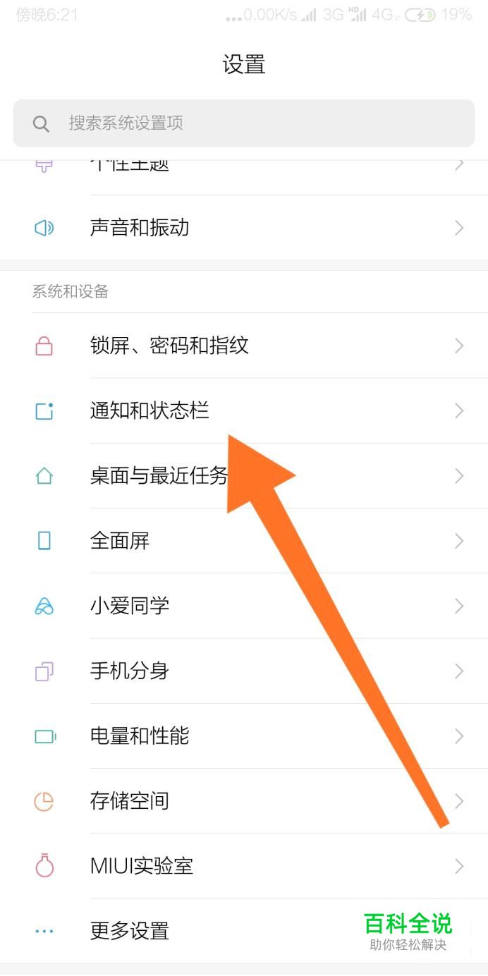 然后找到“通知和状态栏”设置选项,点击进入。