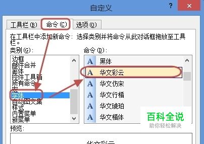 打开“自定义”对话框,在“命令”选项卡中单击“字体”,右侧“命令”中会显示计算机装有的所有字体,这可以选择常用的字体,如“ 华文彩文”,按住鼠标左键拖动其字体到工具栏中某个位置(根据自己实际选择存放位置哦)。