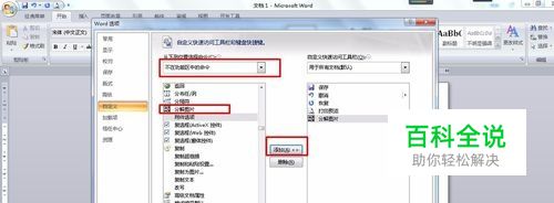 在下拉列表中选择不在功能区的命令,找到分解图片命令,点击添加,把该命令添加到快速访问工具栏中,如图。