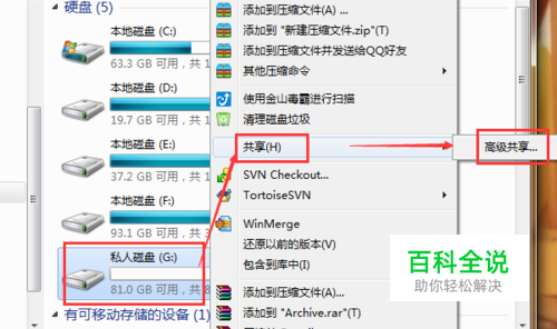 在需要共享的磁盘上,点击 右键--选择 共享,然后选择 高级共享。