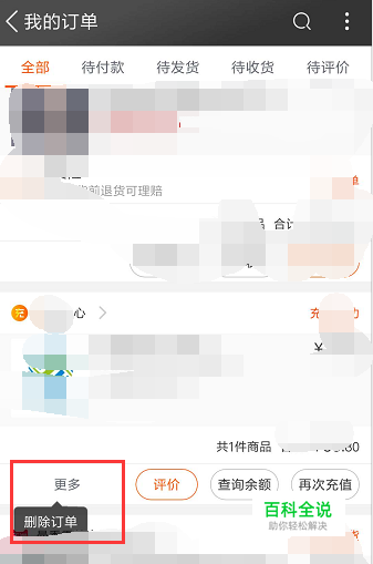 如下图,在订单左侧有个更多的字眼,点击就会显示“删除订单”这个按钮了; 很多朋友会说,我有些订单根本没有这些选项呀; 这里要提醒下各位了,只有交易成功或交易关闭、待付款的订单才能删除哦,进行中的订单如没有确认收货的订单是不能删除的;