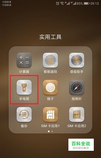 第一步在我们的手机中找到实用工具,点击手电筒,如下图所示: