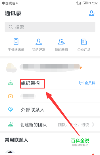 在【通讯录】页面,点击页面中间公司名称下方的【组织架构】。