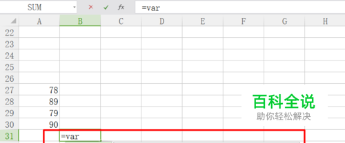 选择某个单元格,在单元格内我们输入方差计算函数“=var()”,如图所示: