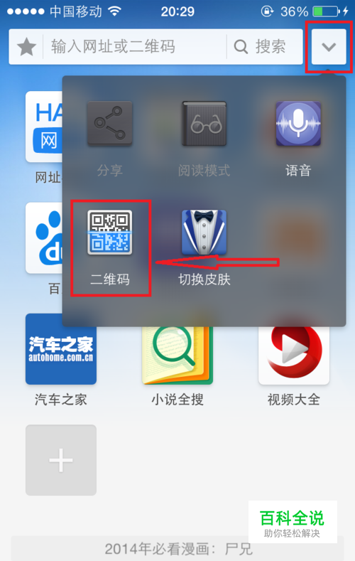 初次使用uc浏览器的童鞋可能不知道uc浏览器如何扫描二维码,打开uc浏览器在最上面搜索边上有个向下的箭头,在里面可以扫描二维码。