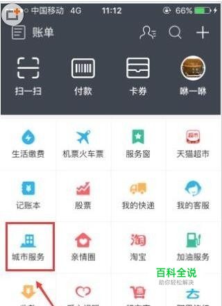 首先登录手机支付宝的账号,然后在其主页找到“城市服务”按键后点击此按键,如下图所示: