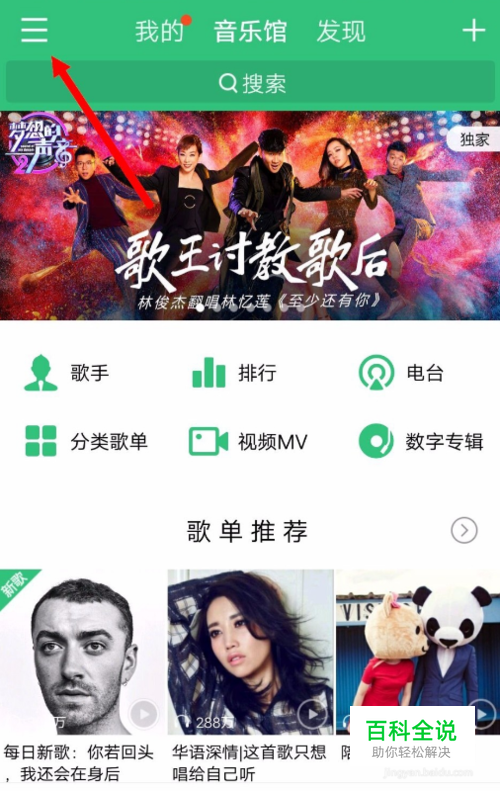 在手机中打开QQ音乐,在首页点击左上角的三个横杠,如图。