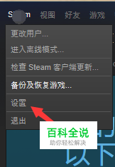 设置: 打开steam软件,点击软件左上角“steam”,点击“设置”。