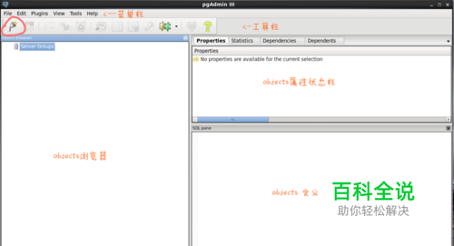 打开PgAdmin III后我们会看到如下界面,非常简洁适用。界面分为 菜单栏、 工具栏、 objects浏览器栏、 objects属性状态栏和 objects定义SQL栏五个栏目组成。