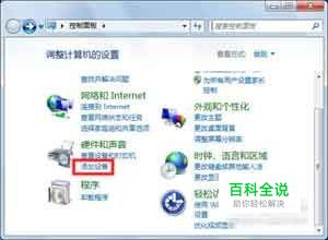 点击“开始”,然后点击“控制面板”。在“硬件和声音”下,点击“添加设备”。如图所示: