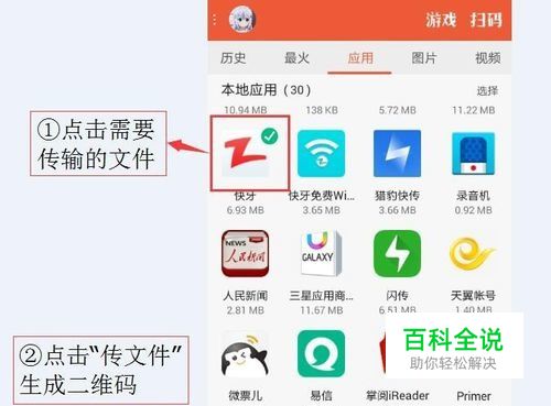 打开快牙app后,找到并点击待传输文件(如应用、图片、音乐、视频等),在底部出现的选项中选择“传文件”,即可生成二维码。