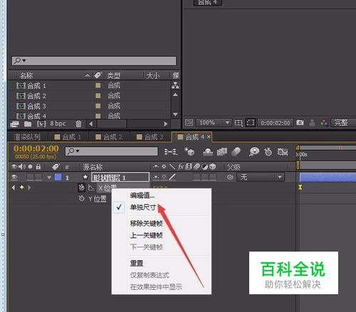 画一个图形,按p键切换到位置,选择关键帧按F9键。然后右键可以选择单独尺寸。