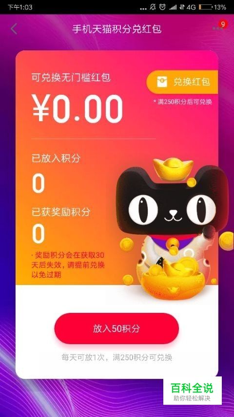 进来之后,我们点击下面的"放入50积分",放积分每天可以放一次,存够250积分可以兑换红包。