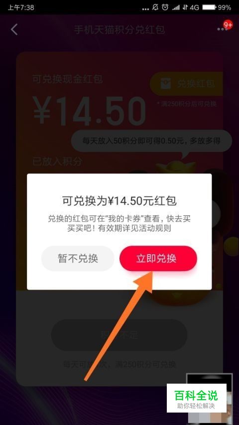 当自己的积分放入大于250时就可以兑换红了,当然可以多放入一些一起兑换。如图,想兑换时点击图片中的"兑换红包"。