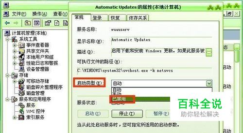 双击AutomaticUpdates项会出现AutomaticUpdates的属性设置窗口,在窗口的启动类型里通过点击右边的下拉箭头选择已禁用,然后再点击确定关闭窗口即可