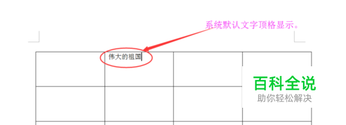 我们紧接着在表格内输入一行文字“伟大的祖国”,很显然系统 默认我们输入的文字显示在表格的顶端,而非表格中央。如下图: