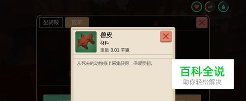 制作兽皮: 制作一个复杂的或者高级的道具,往往一种材料是不够的。所以除了木材之外我们还需要去获得兽皮,注意有兽皮的话只有驯服体型比较大的动物,才会有的。比如说你去打鸡的话那就没有的。