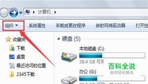 打开计算机硬盘主页页面后,看到页面的左上方有 个【组织】字样的按钮,点击后面的小箭头。如图所示。