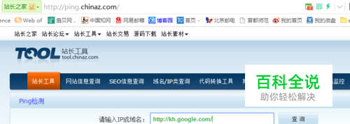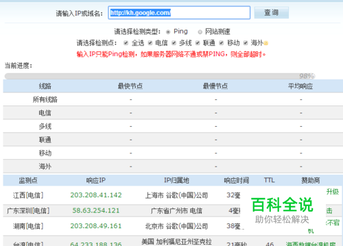 使用站长工具网站查找可以使用的服务器地址,在如图的框中输入http://kh.google.com/,点击查询。通过这个我们可以检测服务器的响应速度,如果该服务器被封禁那么响应时间就会超时