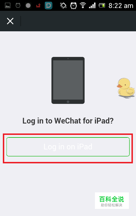 好了然后平板上登录成功,手机上也会显示“ipad Wechat is logged on”(已在ipad上登录)