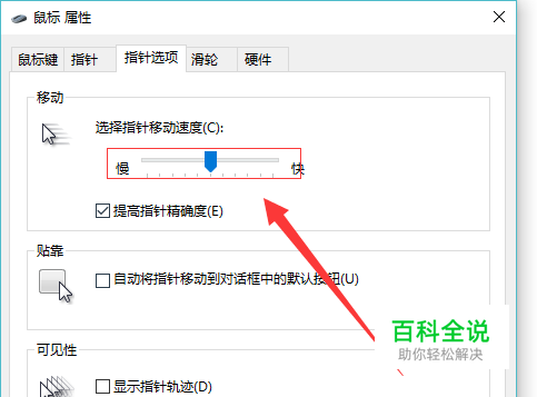 然后点击指针选项,调整一下鼠标的移动速度,也就是反应的灵敏度,找到一个适合自己的速度就可以了。