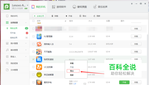 将手机连接电脑后我们会看到手机中已安装的应用,右击应用选择导出并选择目录即可。