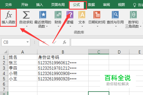 比如我们从一个身份证号码当中知道这个是不是90后,或者我们要知道这几个人的年龄,那么我们都是需要用到函数的,这里我们点击公式,然后点击插入函数。