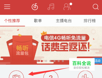 首先,我们打开网易云音乐,然后在页面如图所示的位置有个私人FM,我们点击打开它