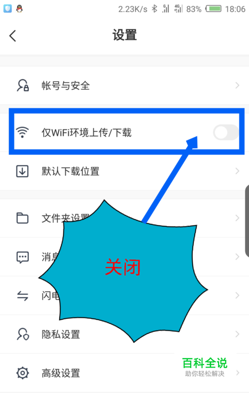 打开设置界面后,有个有个仅WiFi环境上传或下载选项,点击后面的滑块关闭。如图所示