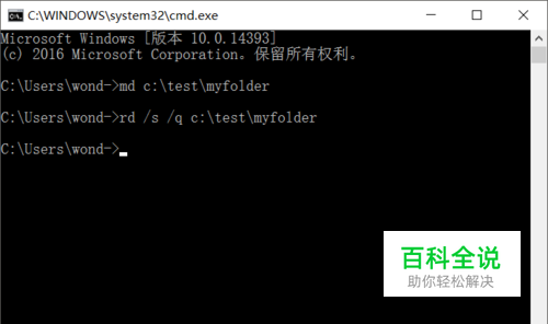 那我们又该如何删除文件夹呢,使用rd或rmdir命令,完整命令 rd /s /q [盘符:\][路径\]新目录名,因为rd只能删除空的文件夹,而如果其中有子文件或子文件夹的时候就会停下来,这时我们加上/s就可以直接删除,但是删除过程中会提示你是否确定删除,对于懒癌患者我们有添加了/q,即quiet,安静模式;所以使用以上命令会完整删除你选中的整个文件夹。