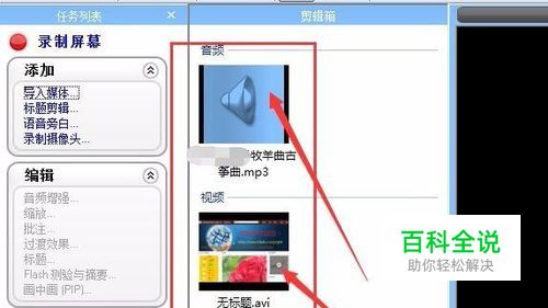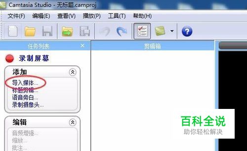 首先启动camtasia studio ,单击导入媒体,先后导入一个视频文件和一个音频文件。